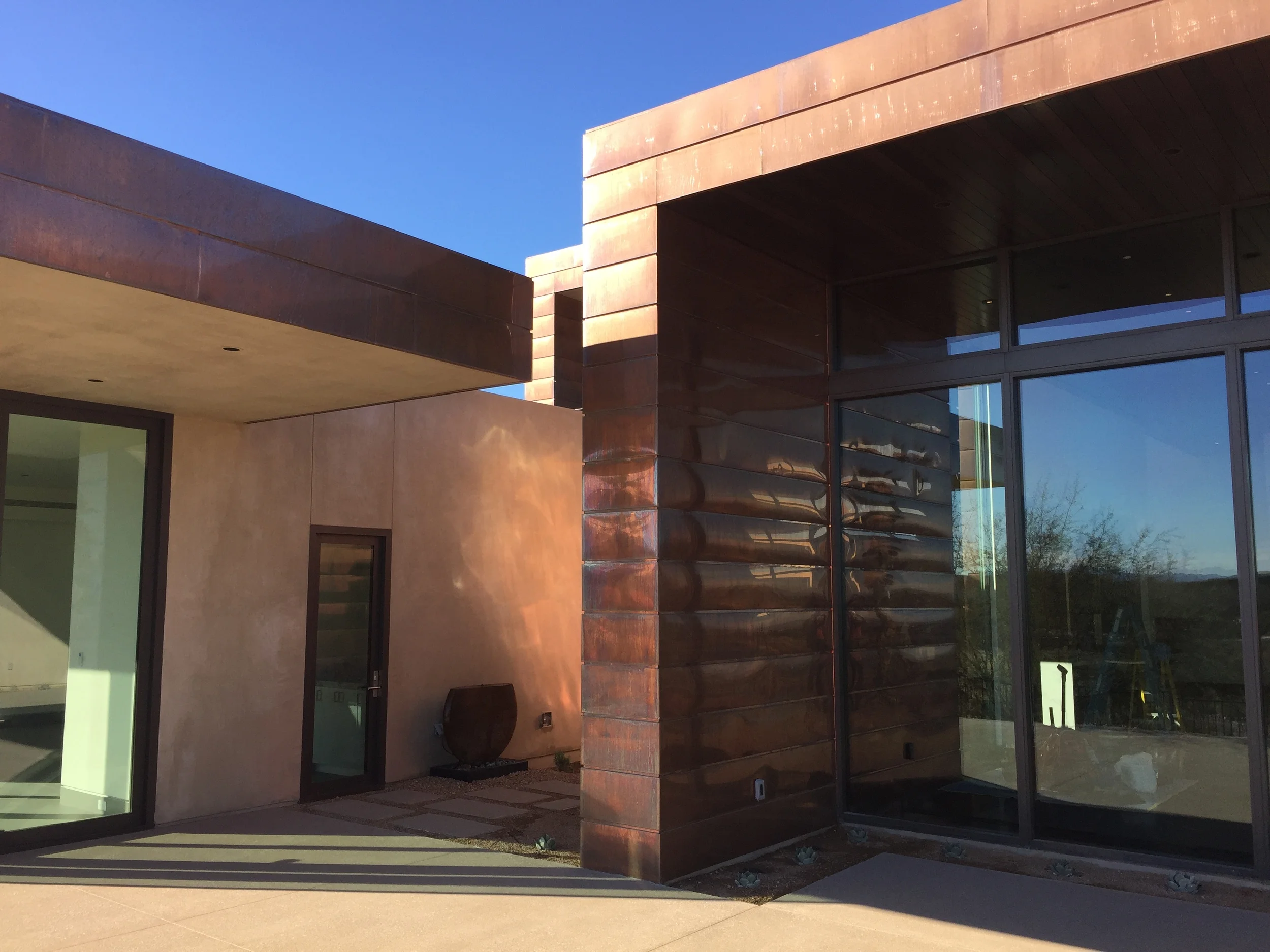 Drawing inspiration from homes of the Italian upper class, Arrowhead is an adaption of the domus. Guests are greeted with a quiet interior courtyard, customary of the entry sequence in an Italian courtyard home. The exterior is faced with two main materials: unobtrusive stucco and deep, lavish, masculine copper to feature as a restrained symbol of opulence. The interior features refined materials including dark chocolate wood ceilings, rich dark tile, and pristine white walls.